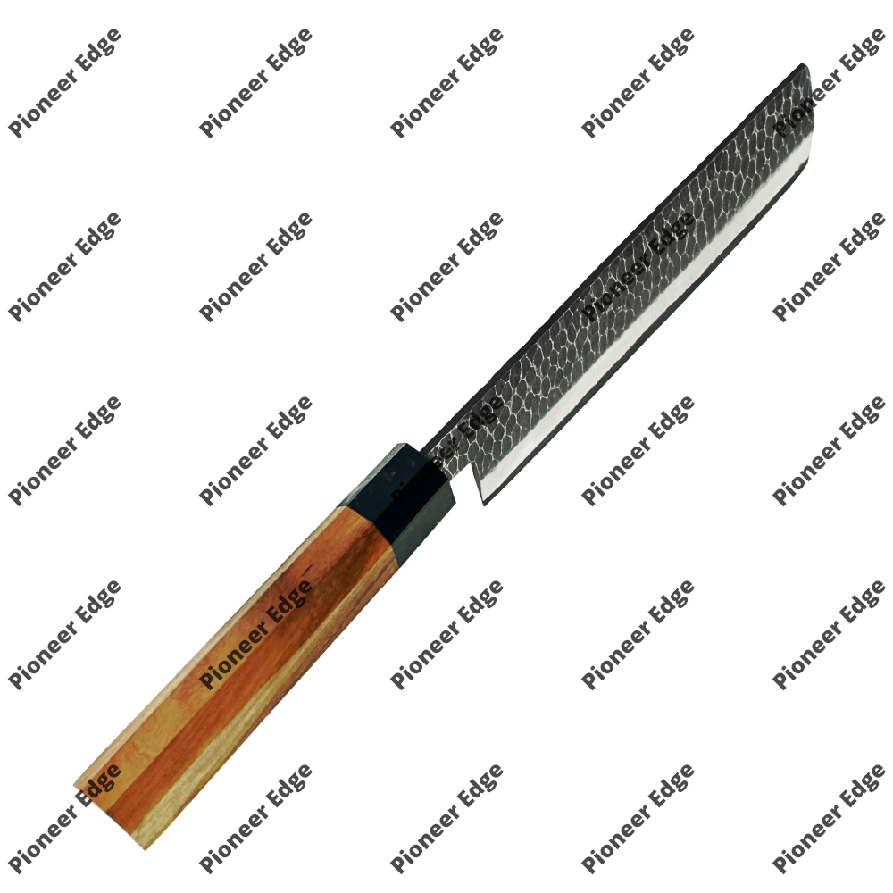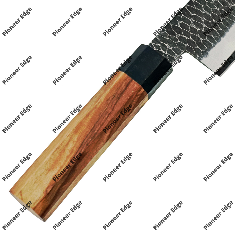 * **Finish:** The blade showcases a distinctive **Tsuchime (hammered)** finish on the upper portion. This honeycomb-like texture is not only aesthetic but also functional, as it creates small air pockets that prevent food from sticking to the steel.