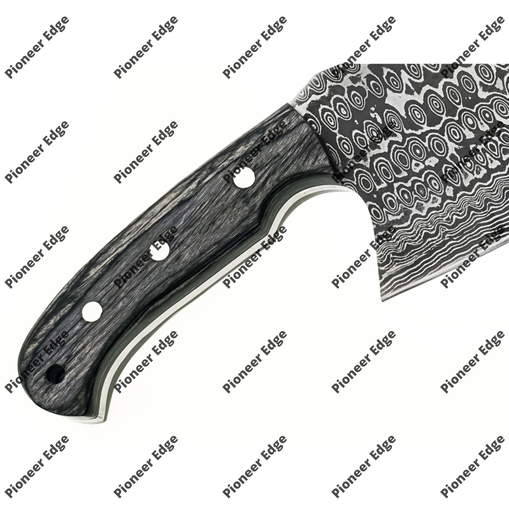 * **Handle Material:** High-density **Black and Grey Pakkawood** (or stabilized wood composite), featuring a deep, layered grain that provides a secure, moisture-resistant grip.